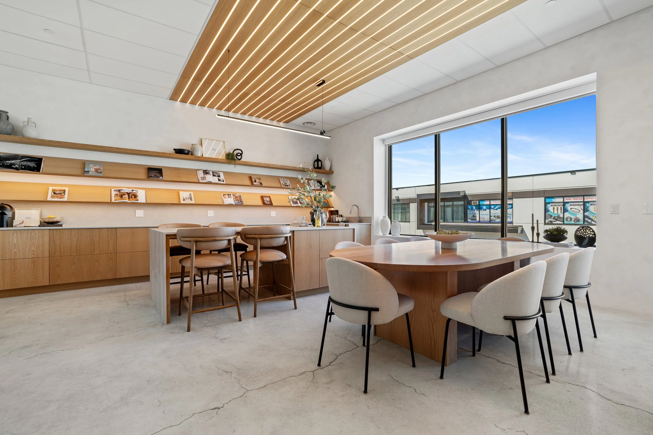 A full-service commercial design for a high-end showroom and headquarters, grounded in an organic modern aesthetic. Working within the building's existing footprint, we introduced a considered layer of high-end materials and natural elements, from the custom white oak slat ceiling and integrated linear lighting to stone surfaces, polished concrete floors, and tactile millwork that carries through every room. Each decision was made in service of creativity and collaboration, using the psychology of space to quietly calm the nervous system and support the way a team thinks, gathers, and works. The result is a workplace that reads as a showroom, and a showroom that feels unmistakably like a home.